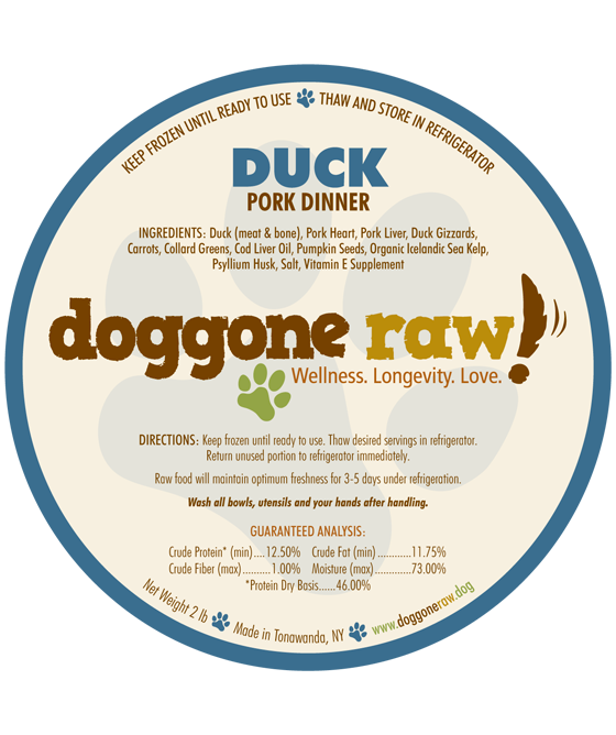 Duck (meat & bone), Pork Liver, Duck Gizzards, Carrots, Collard Greens, Cod Liver Oil, Pumpkin Seeds, Organic Icelandic Sea Kelp, Psyllium Husk, Salt, Vitamin E Supplement.